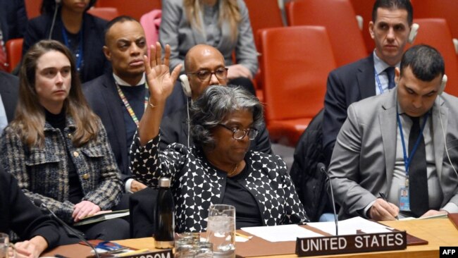 Đại sứ Hoa Kỳ tại Liên hiệp quốc Linda Thomas-Greenfield, ngày 20/2/2024, phủ quyết dự thảo nghị quyết do Algeria đưa ra tại Hội đồng Bảo an Liên hiệp quốc về cuộc chiến Israel-Hamas.Hoa Kỳ hôm 20/2 một lần nữa phủ quyết dự thảo nghị quyết của Hội đồng Bảo an Liên hiệp quốc về cuộc chiến Israel-Hamas, ngăn chặn đề nghị về một cuộc ngừng bắn nhân đạo ngay lập tức. Thay vào đó, Mỹ thúc đẩy cơ quan gồm 15 thành viên kêu gọi một lệnh ngừng bắn tạm thời liên quan đến việc thả con tin do Hamas bắt giữ.