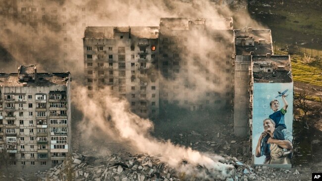 Khói bốc lên từ các tòa nhà ở Bakhmut, Ukraine, nơi diễn ra các trận giao tranh ác liệt giữa quân đội Ukraine và Nga, ngày 26 tháng 4 năm 2023.Khi cuộc chiến ở Ukraine bước sang năm thứ ba, cuộc xung đột sẽ được quyết định không chỉ trên chiến trường mà còn ở các thủ đô phương Tây và những nơi khác xa chiến tuyến.