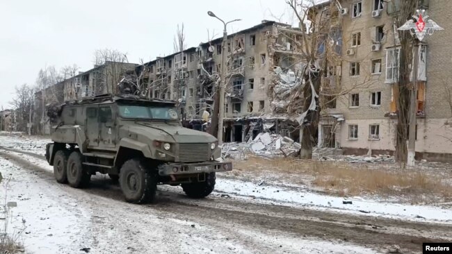 Một xe quân sự trong thị trấn Avdiivka, Ukraine.Hôm 20/2, Tổng thống Nga Vladimir Putin nói quân đội Nga sẽ tiến sâu hơn vào Ukraine để phát huy thành công trên chiến trường sau khi thị trấn Avdiivka thất thủ, ông nói rằng quân đội Ukraine ở đó đã buộc phải bỏ chạy trong hỗn loạn, Reuters tường thuật.