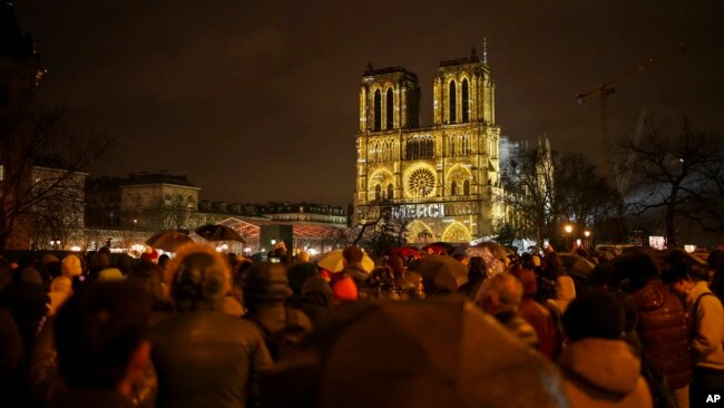 Người dân tập trung bên ngoài Nhà thờ Đức Bà Paris vào ngày thứ Bảy, ngày 7 tháng 12 năm 2024, tại Paris, Pháp để tham dự lễ mở cửa chính thức lần đầu tiên kể từ sau một trận hỏa hoạn kinh hoàng khiến nhà thờ gần như sụp đổ vào năm 2019.Tổng giám mục Paris Laurent Ulrich gõ cửa Nhà thờ Đức Bà ba lần bằng gậy mục tử, và một bài thánh ca được xướng lên bên trong để đáp lại, tại một buổi lễ vào ngày thứ Bảy đánh dấu sự kiện Nhà thờ Đức Bà Paris mới được trùng tu mở cửa trở lại.