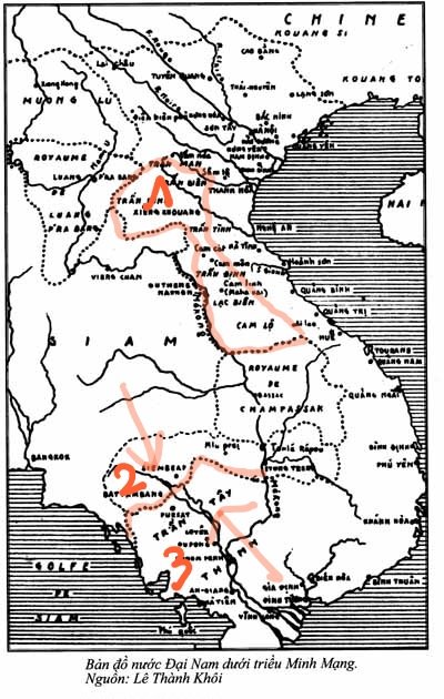 Trong ảnh minh họa, số 1 là đất Việt Nam sau bị mất về Lào (do Lê Thánh Tông chiếm của Lào từ mấy trăm năm trước). Số 2 là 1/2 đất Cam do Xiêm chiếm, số 3 là Trấn Tây Thành do Minh Mạng chiếm của Chân Lạp, sau Pháp trả lại. Bản đồ thời Minh Mạng, đất nước ta to nhất trong lịch sử. Đất Lào được Pháp trả từ Xiêm nó vụn vụn không thể hiện trong bản đồ này.