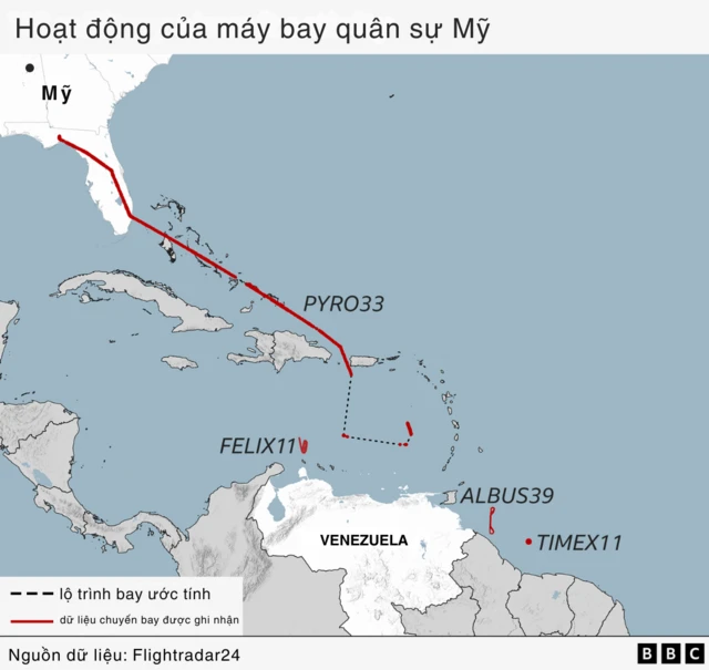 BBC Verify đã sử dụng dữ liệu theo dõi chuyến bay để xác định bốn máy bay quân sự Mỹ bay gần Venezuela vào ngày 20 và 21/11