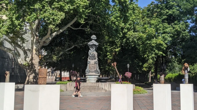 Tượng Pushkin ở Odesa, đằng sau ông trưng bày những mảnh bom Nga ném xuống thành phố này