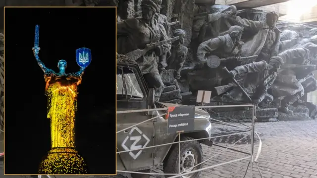 Tượng Mẹ Tổ quốc cao 102m vốn cầm trên tay chiếc khiên khổng lồ có biểu tượng búa liềm. Trước chiến tranh, các kỹ sư tranh cãi triền miên vì khó khăn và tốn kém, nhưng chỉ vài tháng sau khi Nga tấn công, búa liềm đã bị thay bằng cây đinh ba của nền văn minh Rus thời trung cổ (ảnh nhỏ). Quần thể tượng đài Xô-viết dưới chân Mẹ Tổ quốc vẫn giữ nguyên, nhưng được trưng bày thêm xác tên lửa và xe tăng Nga.