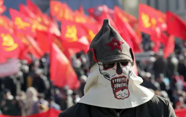Một người Ukraine đeo khẩu trang và đội mũ Hồng quân biểu tình phản đối một cuộc mít tinh của Đảng Cộng sản tại Kyiv vào ngày 7/11/2008