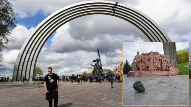 Vòm Hữu nghị các Dân tộc khổng lồ bị một nhóm nghệ sĩ dán đề can hình tia sét rạn nứt (ảnh lớn). Khi bức tượng hai công nhân Nga-Ukraine bị dỡ bỏ, một đầu tượng bị đứt lìa, lăn lóc dưới đất (ảnh nhỏ).