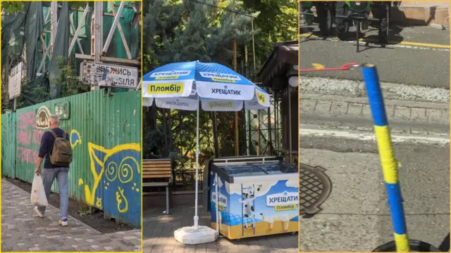 Màu cờ Ukraine hòa quyện vào nghệ thuật đường phố, quảng cáo, các sản phẩm tiêu dùng, thậm chí cả một cây cột báo hiệu sửa đường ở Odesa cũng được sơn thành màu cờ Tổ quốc.