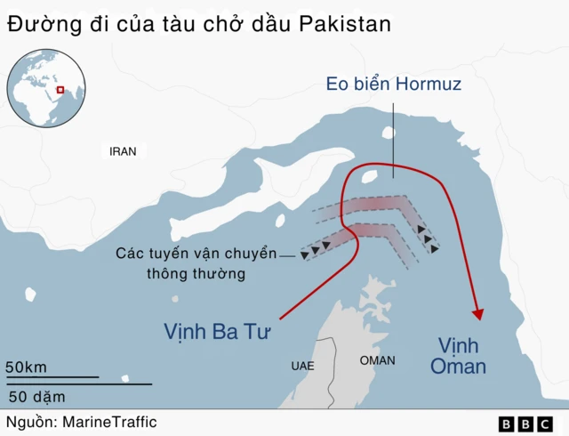 Dữ liệu theo dõi của một tàu chở dầu treo cờ Pakistan cho thấy con tàu này đã đi sát bờ biển Iran trong chuyến đi qua eo biển vào ngày 15/3, thay vì tuyến đường phổ biến hơn ở khu vực giữa eo biển.